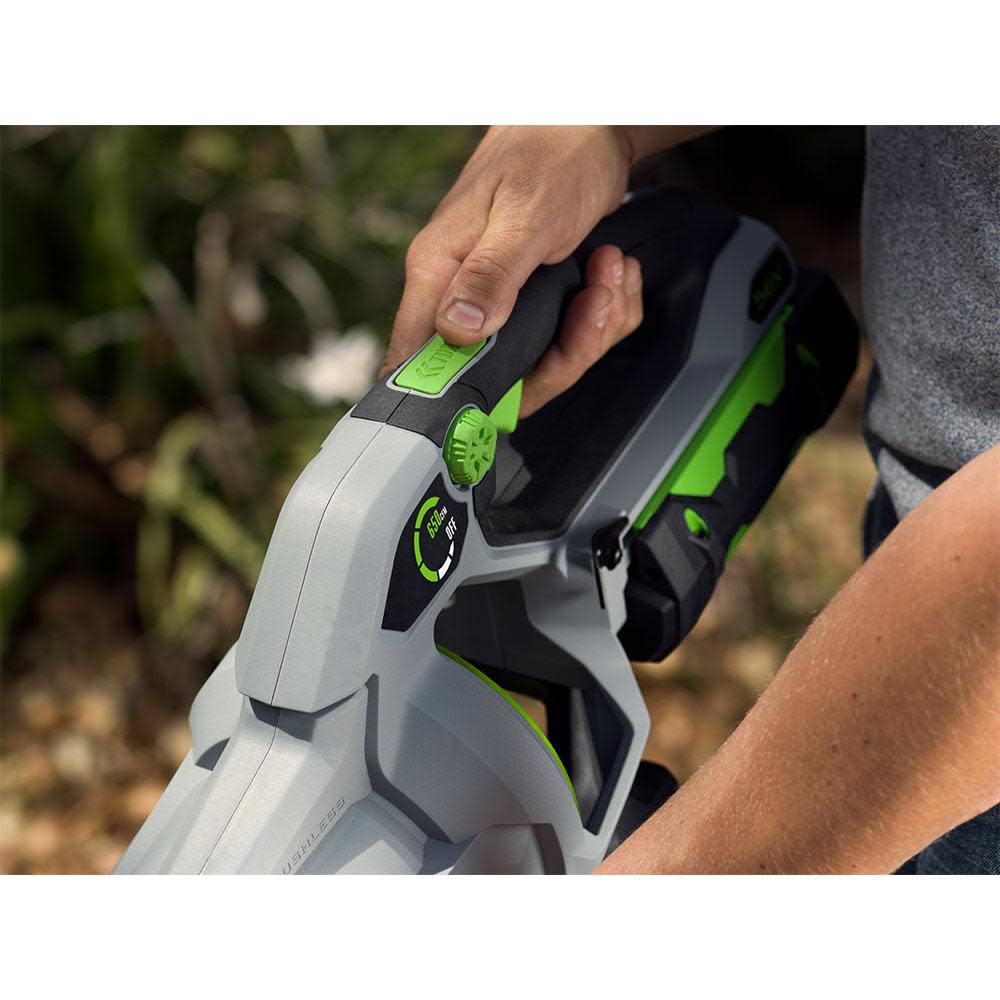 The industry’s most powerful blower is here! Introducing the 650 CFM EGO POWER+ Blower. With air speeds that compare to a category 5 hurricane of 180 MPH, this blower can move wet leaves, rocks, mud, snow and more. With an all new lock on speed control dial, you can adjust your speed from 250 CFM to 500 CFM. When you are ready to move the heavy debris hit the turbo button for 650 CFM! All of this industry leading power is combined with industry leading run times; over 90 minutes of continuous run time. The high-efficiency brushless motor delivers longer run time, low vibrations and an extended motor life. Turbine fan engineering, inspired by advanced aeronautics technology, performs better than premium gas-powered models. The included nozzles make clearing debris in all conditions easy! This quiet, light-weight and compact blower gets the job done faster and quieter than gas! Experience Power Beyond Belief without the noise, fuss and fumes. Battery and charger are sold separately.