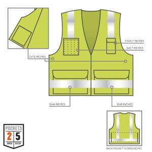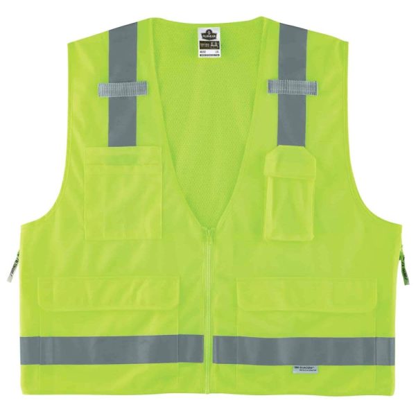 Class 2 Surveyors Vest: Solid front, Mesh back, zipper closure. Pockets, pockets, pockets! ANSI-compliant poly solid front (3.6oz)/mesh back (3.3oz). Zipper closure. 2-In ANSI-compliant 3Mâ„¢ Scotchliteâ„¢ reflective.