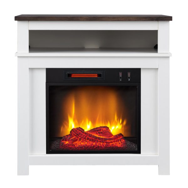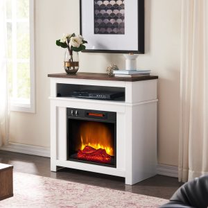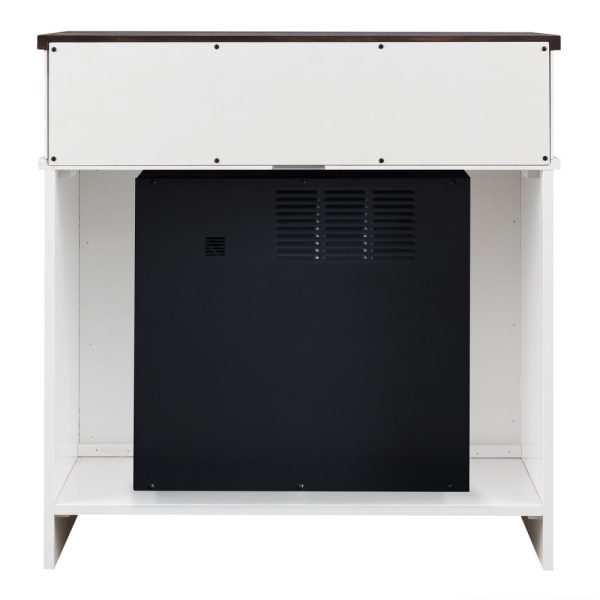 Two tone Electric Fireplace perfect for smaller spaces. The combination of the white case and walnut plank top make a stunning statement. The open storage above the insert adds functionality to the small package. Place this so all your guest can see and let your style shine.