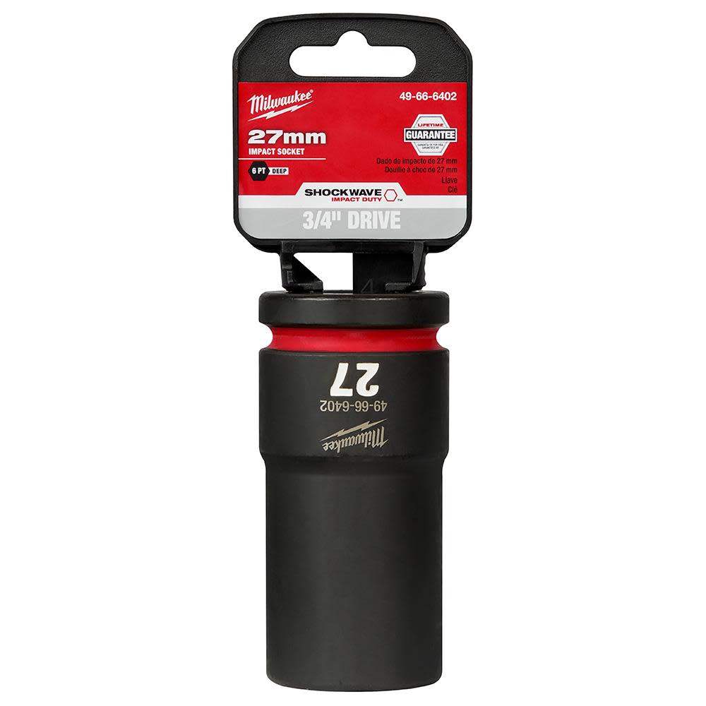 The MILWAUKEE® SHOCKWAVE Impact Dutyâ„¢ 3/4″ Drive 27MM Standard 6 Point Socket features the boldest, longest-lasting markings and extreme impact durability in high torque applications. The stamped and ink-filled size marking enables an accurate socket selection every time throughout the life of the socket. Engineered with high-strength forged steel for optimized performance in heavy-duty applications, and a non-slip hex geometry prevents fastener rounding. The dual-hole design and ring groove allow for easy socket attachment and removal. All SHOCKWAVE Impact Dutyâ„¢ Sockets are backed by a Lifetime Guarantee and meet ASME industry standards. Compatible with optional Retaining Ring (49-66-6744).