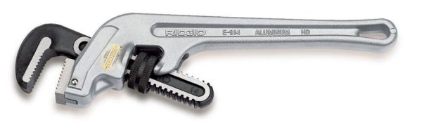 The RIDGID® 10-inch aluminum end wrench is an extremely light, compact tool ideal for overhead jobs or close quarter applications. This tool features a unique angled head for adjustments in areas where a normal wrench won’t fit, and a 1-1/2 in. pipe capacity to fit around many household pipes. The aluminum wrench’s head features an easily adjustable spinning nut, so you can open or close it quickly. A full aluminum body also means that this RIDGID wrench is almost 40 percent lighter than any comparable cast-iron tool, and with a feather weight of only 1 pound, it’s easy to carry around without developing fatigue. Its jaws and other parts are standard with other Ridgid tools so you can easily replace parts as needed.