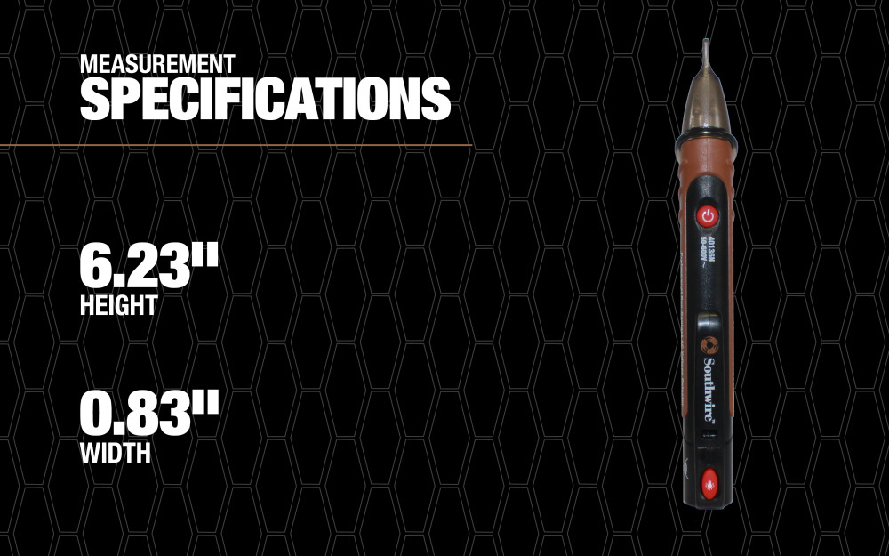 Southwire Pro 40136N AC non-contact voltage (NCV) pen tester a valuable addition to your tool bag. Use it whenever you perform electrical work to identify where voltage is present. Detects voltage in wires, light switches, circuit breakers, outlets and light fixtures. Press the On button and the detection tip glows green. Move the detector tip close to the electrical wire or device being tested. If voltage is detected, the detection tip will change from green to red and begin flashing. The NCV will also beep loudly. The 40136N can also be inserted directly into electrical outlets to verify operation. All Southwire non-contact voltage detectors come with a built-in focused LED flashlight so you can illuminate dark areas. Auto power off feature helps conserve battery power. Silent Mode allows you to silence the beeper for quiet areas like hospitals, office buildings, and schools. As an added safety feature, the 40136N has a low-battery self test which periodically checks the condition of the batteries. If battery voltage becomes too low, the self-test circuit turn off the non-contact voltage detector until the batteries are replaced. The 40136N is UL listed. Not designed for use with Tamper Resistant (TR) outlets.