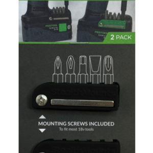 The StealthMounts Magnetic Bit holder includes mounting screws included to fit most 18v tools. The magnetic strip holds screws or extra bits and can fit up to 5 bits per holder. This pack contains 2 bit holders total and is compatible with Festool tools.